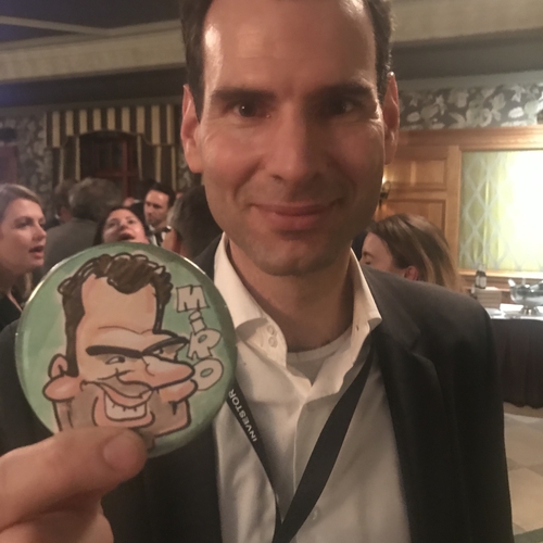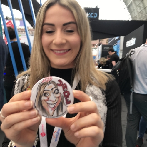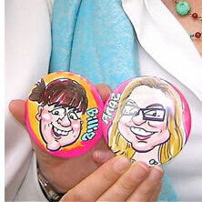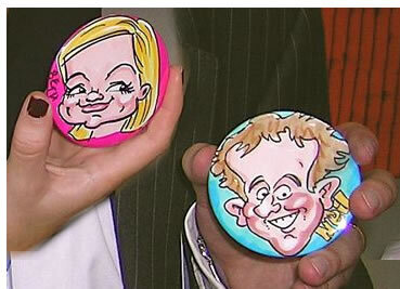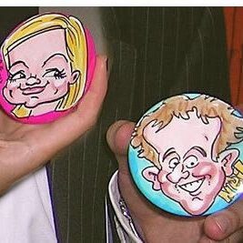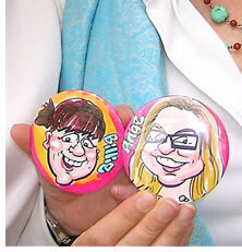 We draw your caricature onto paper in full colour in just a couple of minutes. It is then professionally die-stamped into a glossy 77mm badge, fridge magnet or handbag mirror - a unique souvenir of any event! (And a lot easier to look after during a raucous party!)
