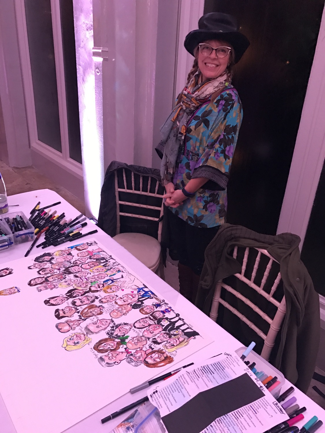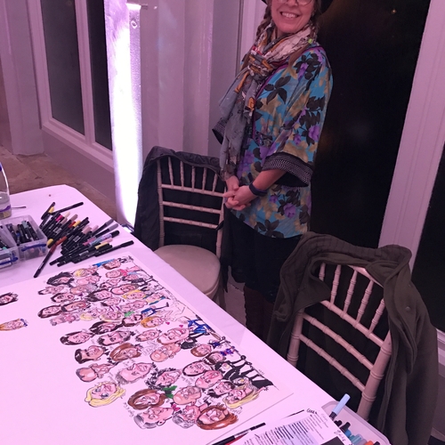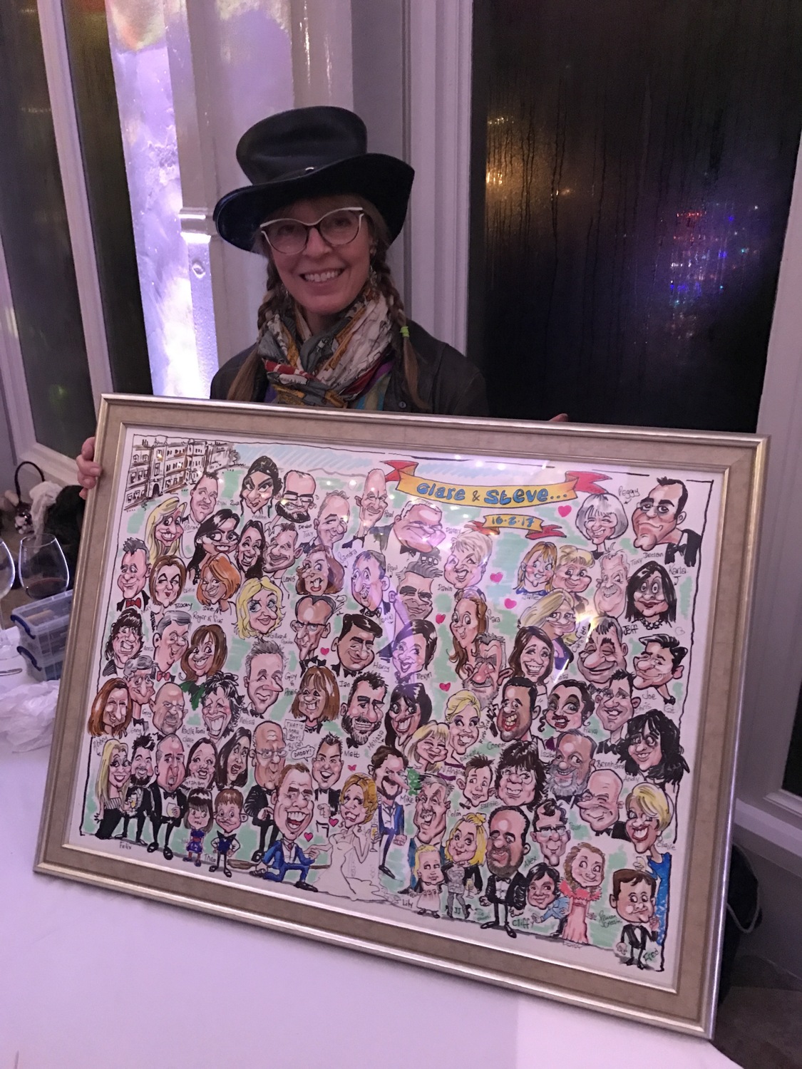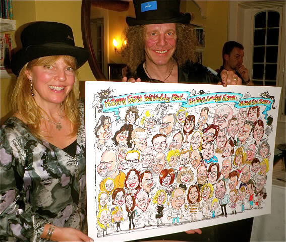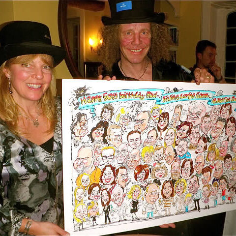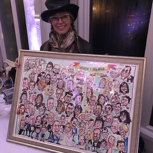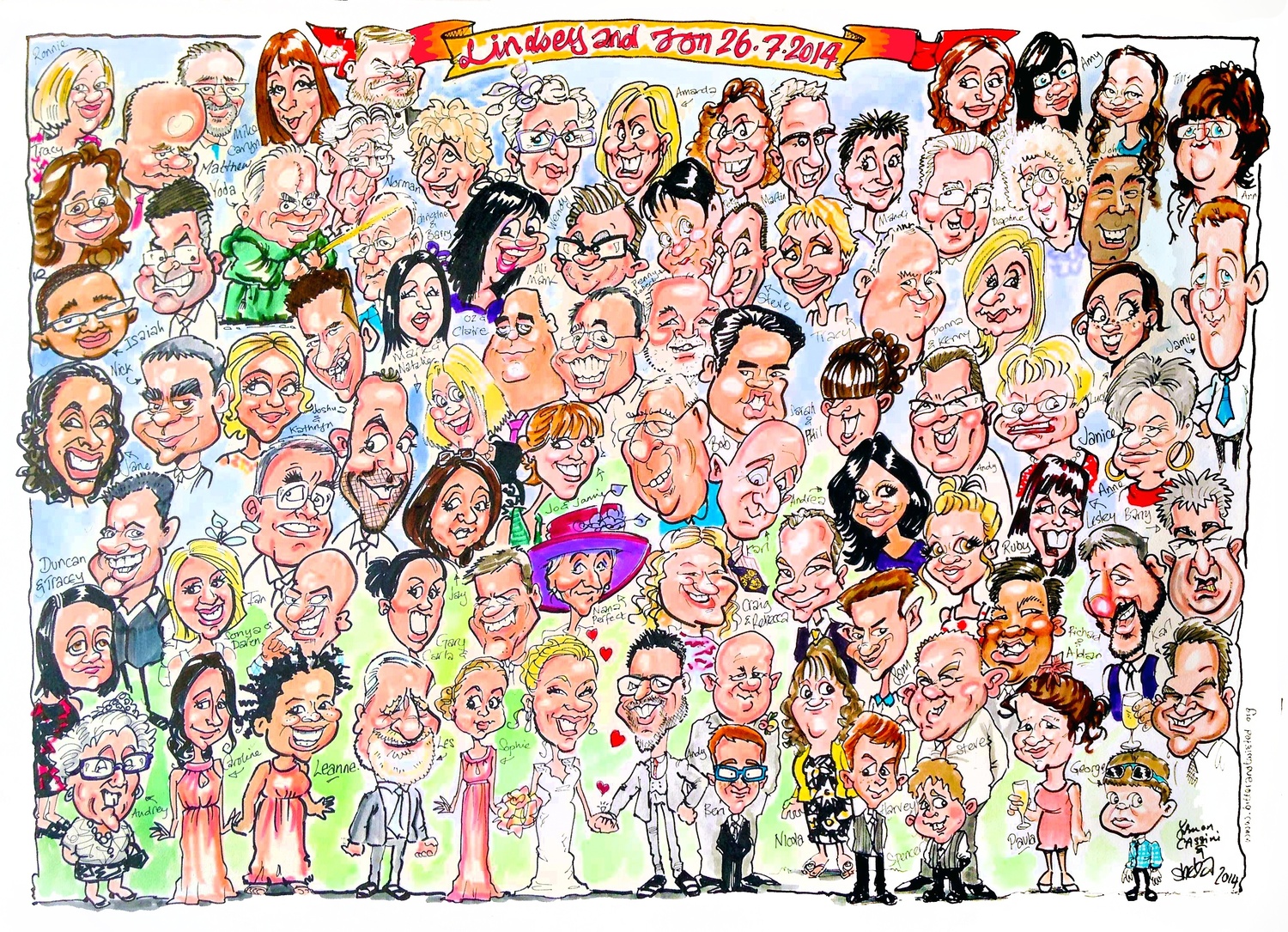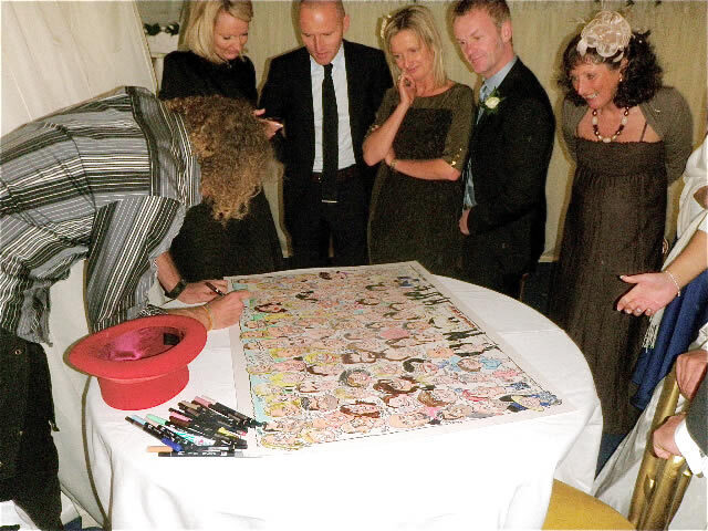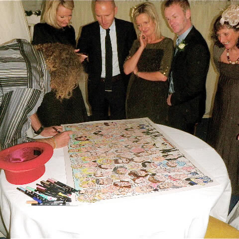 Watch the artwork appear before your eyes as Simon and Sheba work together on one sheet to draw all your guests onto one big picture - usually about A1 size. It takes us 2 - 3 hours to produce the finished artwork - in full colour! - and we'll even frame it on the spot if you like.. This can then be copied, reduced, laminated or e-mailed for whoever wants a copy. You of course get to keep the original.